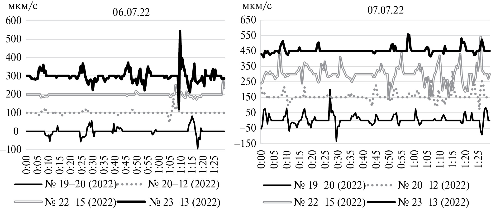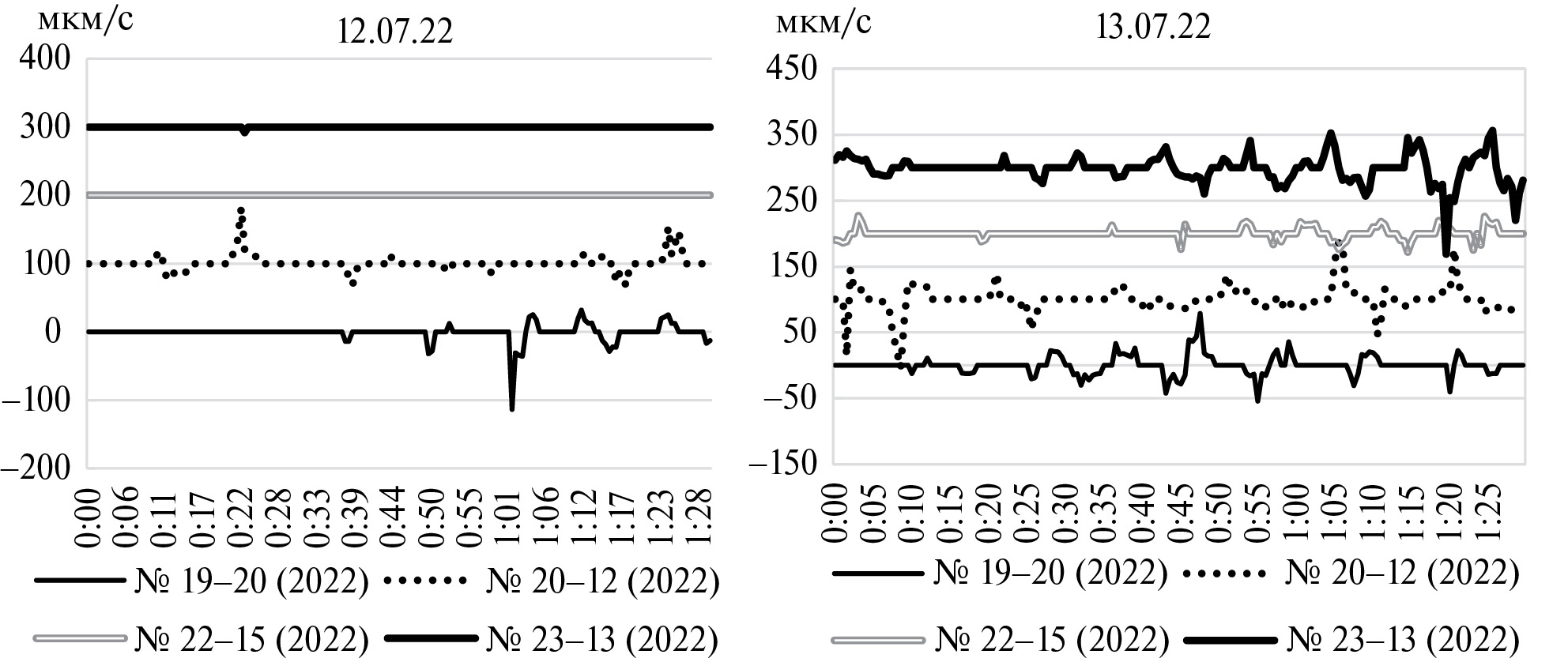 Рис. 7. Динамика скорости гидроплазматических течений у четырех колоний D. pumila в первые (12.07.22) и вторые сутки (13.07.22) восстановления колоний при температуре морской воды до 16 оC. Продолжительность съемки 1.5 ч каждая. По оси Х время с начала видеорегистрации.