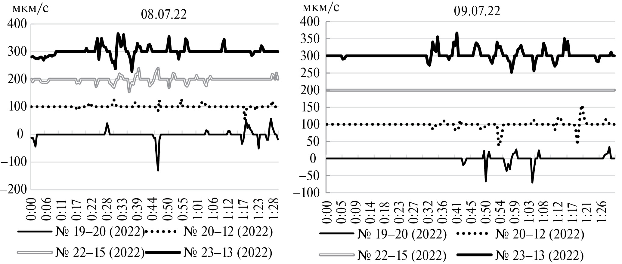 Рис. 4. Динамика скорости гидроплазматических течений у четырех колоний D. pumila на вторые (08.07.22) и третьи (09.07.22) сутки после начала термошока. Продолжительность съемки 1.5 ч каждая. По оси Х время с начала видеорегистрации.