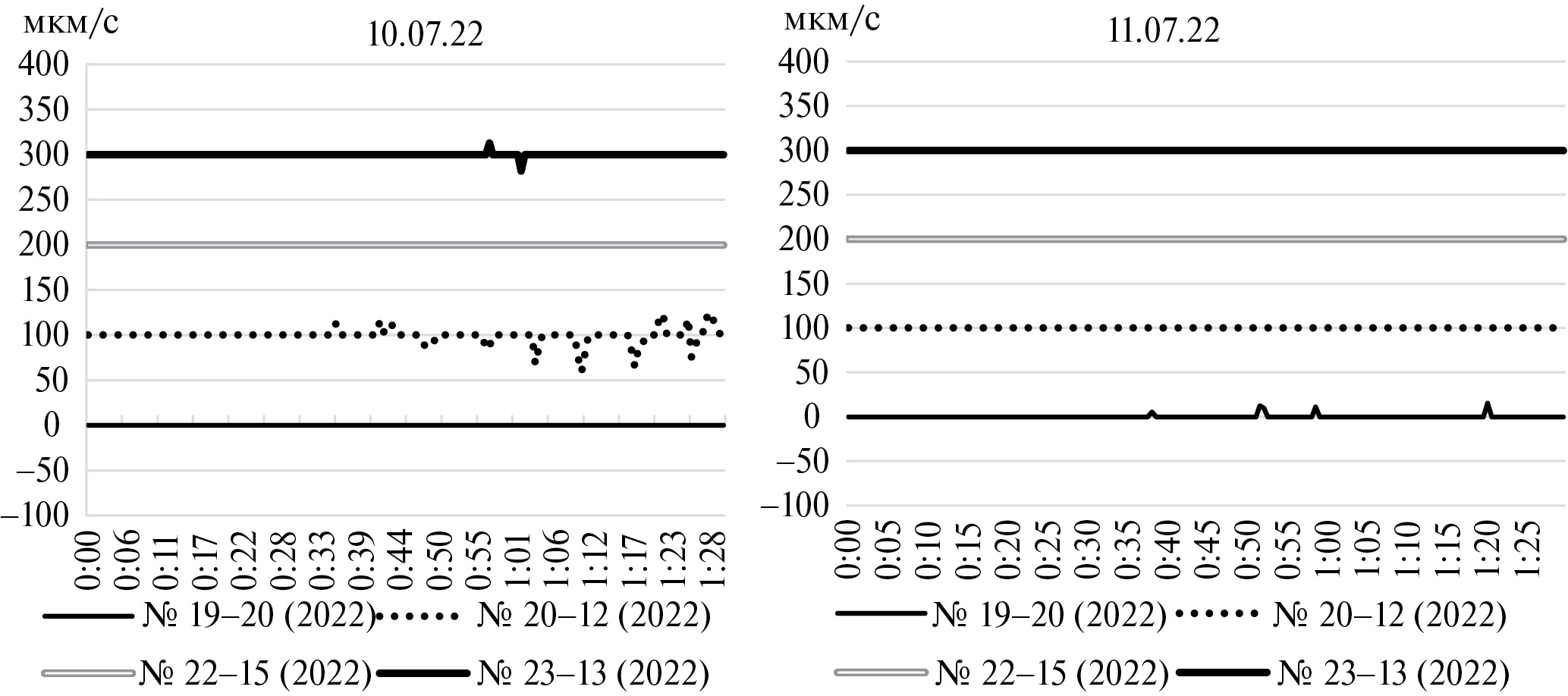 Рис. 5. Динамика скорости гидроплазматических течений у четырех колоний D. pumila на четвертые (10.07.22) и пятые сутки (11.07.22) после начала термошока — повышения температуры морской воды до 25 оC. Продолжительность съемки 1.5 ч каждая. По оси Х время с начала видеорегистрации.