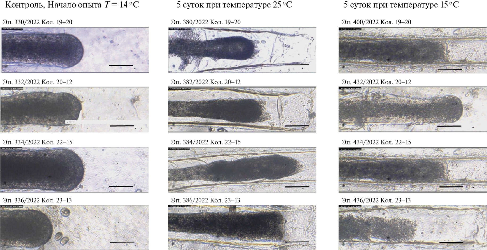 Рис. 6. Фотографии верхушек столонов четырех колоний в начале опыта (слева), в конце пятидневной фазы 25 оС (по центру) и в конце пятидневной фазы восстановления при 15 оС (справа). Масштабная линейка 0.1 мм.