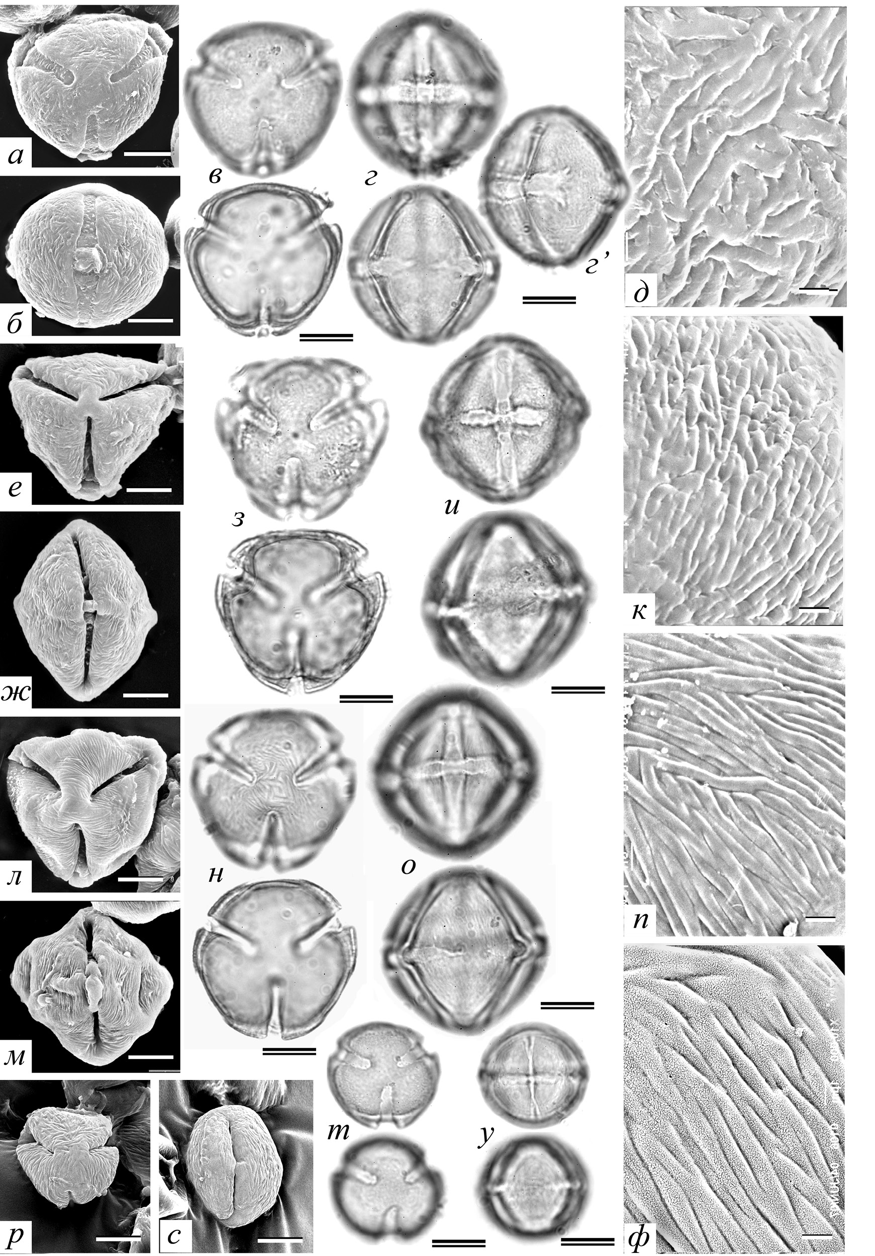 а, в, е, з, л, н, р, т — вид пыльцевого зерна с полюса; б, г, ж, и, м, о, с, у — вид пыльцевого зерна с экватора; д, к, п, ф — скульптура поверхности. а, б, д, е, ж, к, л, м, п, р, с, ф — СЭМ; в, г, з, и, н, о, т, у — СМ. Для каждого пыльцевого зерна (CМ) показан верхний и нижний фокус. Масштабные линейки: а–г, е–и, ж–о, з–у — 10 мкм; д, к, п, ф — 1 мкм.