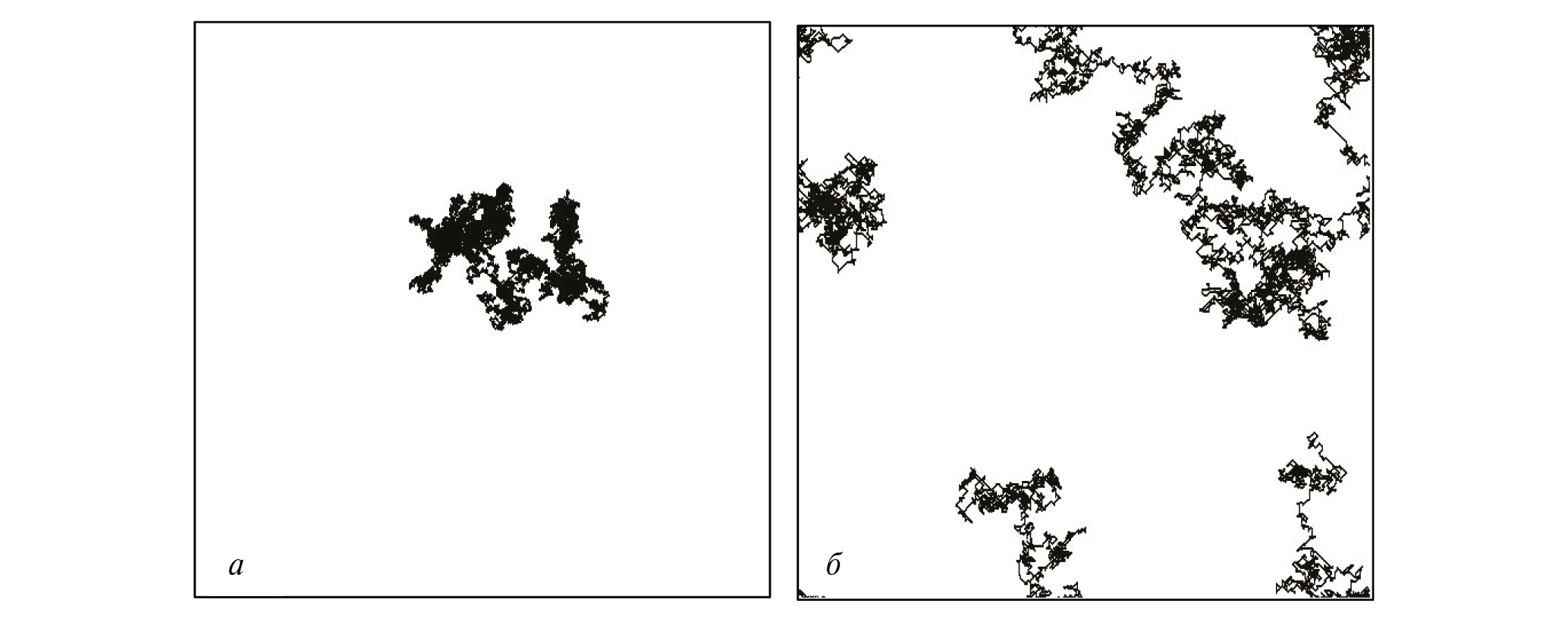 Рис. 1. Траектории движения рыб за 25000 шагов модели при типах перемещения: а – случайном, б – векторизованном.