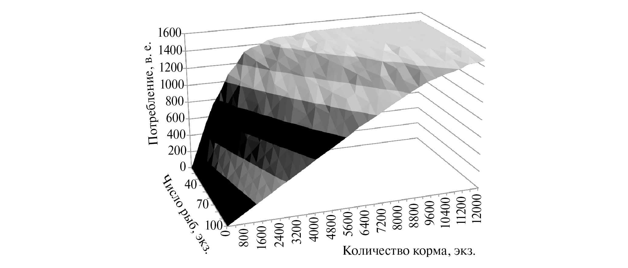 Определенное количество ячеек (их общее число может варьировать и задается в качестве одной из входных переменных модели) в начальный момент времени полагается занятым кормовыми организмами. Алгоритм модели построен таким образом, что в каждой отдельной ячейке пространства не может находиться более одного кормового объекта. Кормовые объекты в течение имитационного эксперимента не меняют своего положения и могут интерпретироваться как организмы зоопланктона, скорость перемещения которых, по сравнению со скоростью перемещения рыб, пренебрежимо мала. При совпадении пространственных координат рыбы и кормового объекта происходит “поедание” последнего, реализующееся с вероятностью, зависящей от физиологического состояния рыбы (степени насыщения, см. ниже). В ходе эксперимента регистрируется количество кормовых объектов, съеденных каждой рыбой. В итоге формируется величина индивидуального рациона, полученного каждой особью по окончании эксперимента. В модели кормовые объекты наделены массой (выраженной в условных весовых единицах), которая задается как случайная величина, распределенная по нормальному закону. Полученный рацион, таким образом, может быть выражен как в количественных, так и в весовых единицах. Поскольку используемая в работе имитационная система является стохастической, индивидуальные рационы, достигнутые отдельными рыбами к концу эксперимента, могут сильно различаться. В анализе, направленном на идентификацию трофических функций, используются величины рационов, усредненные для 50 особей.
