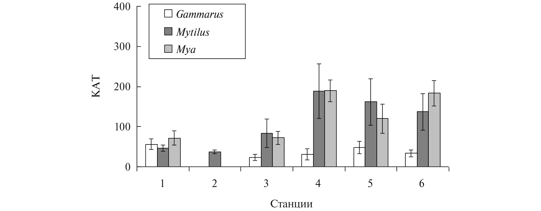 Биомаркеры. Заметные биохимические реакции наблюдались у всех видов вдоль предполагаемого градиента солености воды и условного загрязнения местообитаний. Повышенные величины активности каталазы были выявлены для амфипод на ст. 5 и 6 (рис. 2), они не различались между собой, но были существенно выше, чем на фоновом участке (табл. 2).
