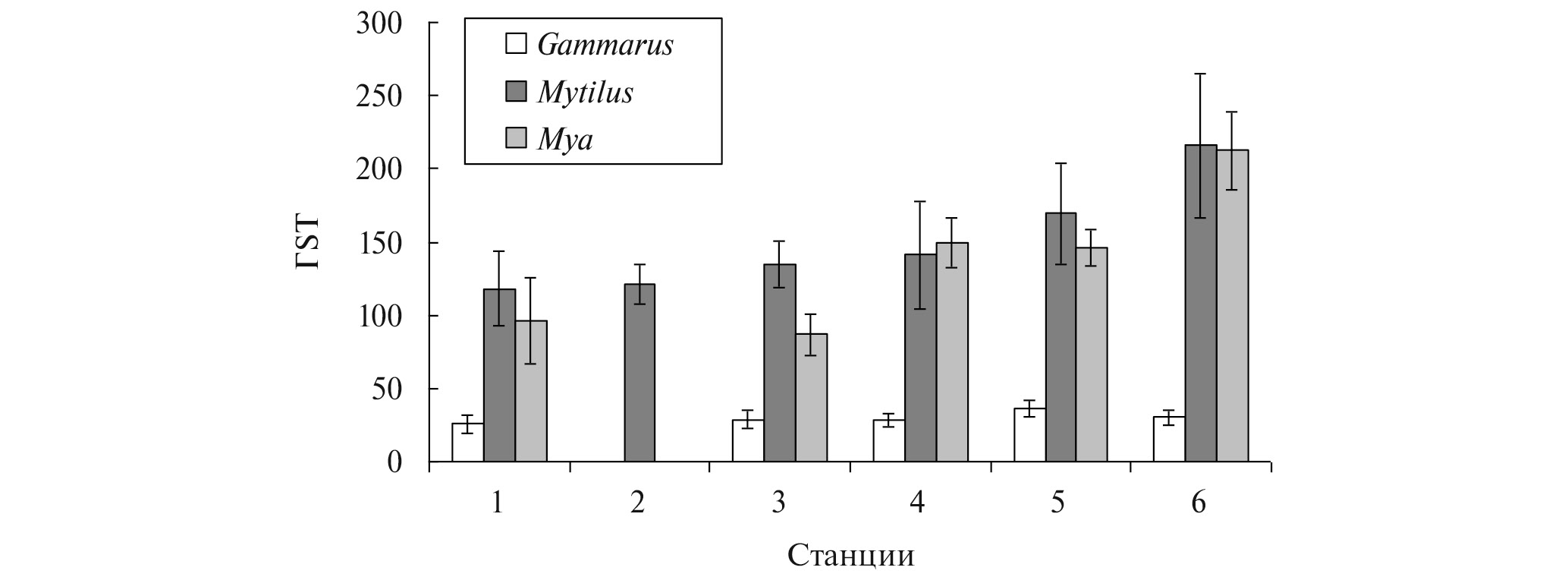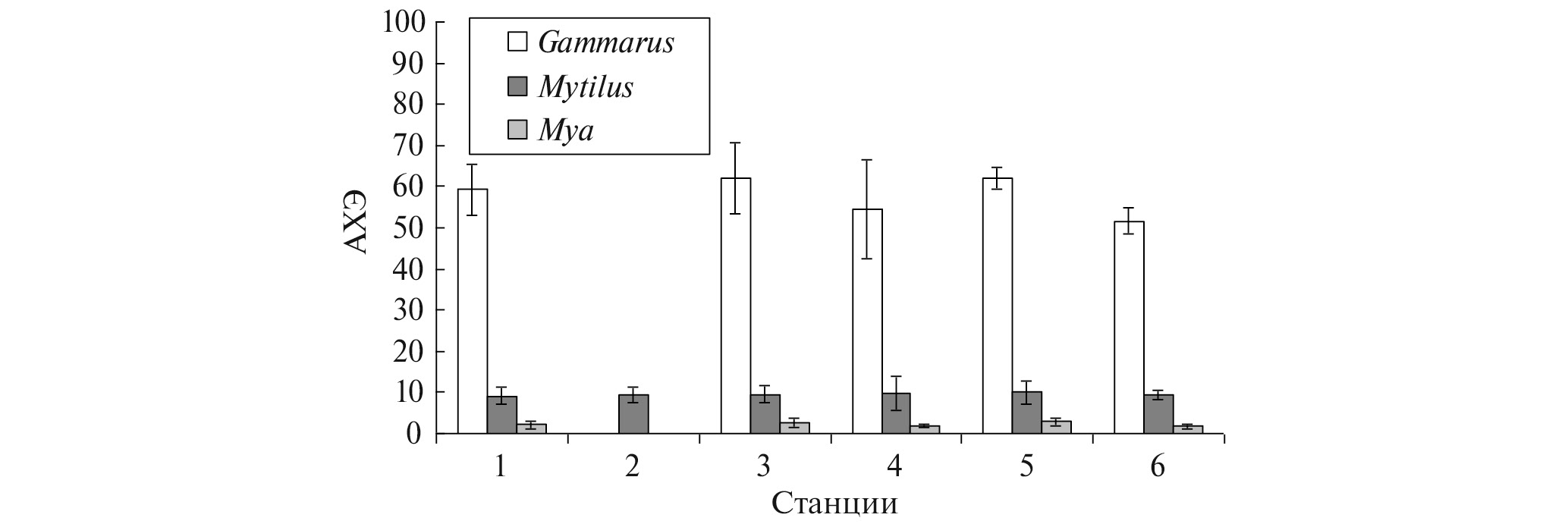 Различия в активности ГSТ были выявлены для всех видов между участками в районе впадения р. Нивы и условно фоновым участком 3 (рис. 3). Для мидий и мий значимыми были и различия между фоновым участком и участком 6. По сравнению с фоновым участком наблюдалось повышение уровней активности глутатион-S-трансферазы амфипод на 26%, а мидий и мий – на 26–61 и 68–145% соответственно. Различия между беспозвоночными всех видов, собранных на “Картеше” (ст. 1) и фоновом участке (ст. 3), были статистически недостоверными (все p > 0.05; табл. 2). Также не отличались по этому показателю мидии с литоральных и сублиторальных зон (Картеш).