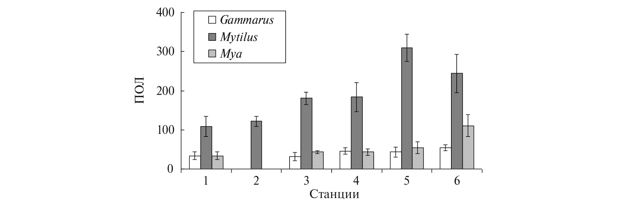 Наиболее отчетливые различия в уровне ПОЛ между участками выявлены для мидий (рис. 4), отмечены значимо более высокие уровни между фоновым участком и станциями 5 и 6. Такие же различия отмечены для “картешанских” мидий и особей со всех остальных участков (все p < 0.005; табл. 2). Для амфипод эти различия были значимыми только между ст. 1 и 6 и ст. 3 и 6, на последней отмечалось статистически значимое повышение в величинах этого показателя (р = 0.01 и 0.03; табл. 2). Сходные тенденции в динамике величин ПОЛ выявлены и в случае мий (р = 0.002).