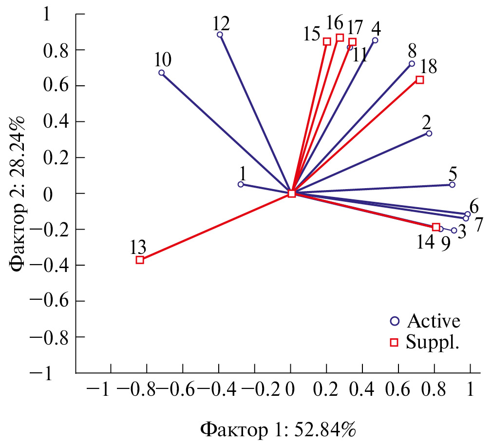 Рис. 6. Анализ главных компонент и связанность переменных по двум основным факторам. 1 – КАТ G.o., 2 – КАТ M.e., 3 – КАТ M.a., 4 – ГST G.o., 5 – ГST M.e., 6 – ГST M.a., 7 – ПОЛ G.o., 8 – ПОЛ M.e., 9 – ПОЛ M.a., 10 – АХЭ G.o., 11 – АХЭ M.e., 12 – АХЭ M.a., 13 – соленость воды, 14 – нефтепродукты, 15 – Cu, 16 – Zn, 17 – Cd, 18 – Pb. Обозначения для видов: G.o. – Gammarus oceanicus, M.e. – Mytilus edulis, M.a. – Mya arenaria. Переменные: Active – активные, Suppl. – дополнительные.