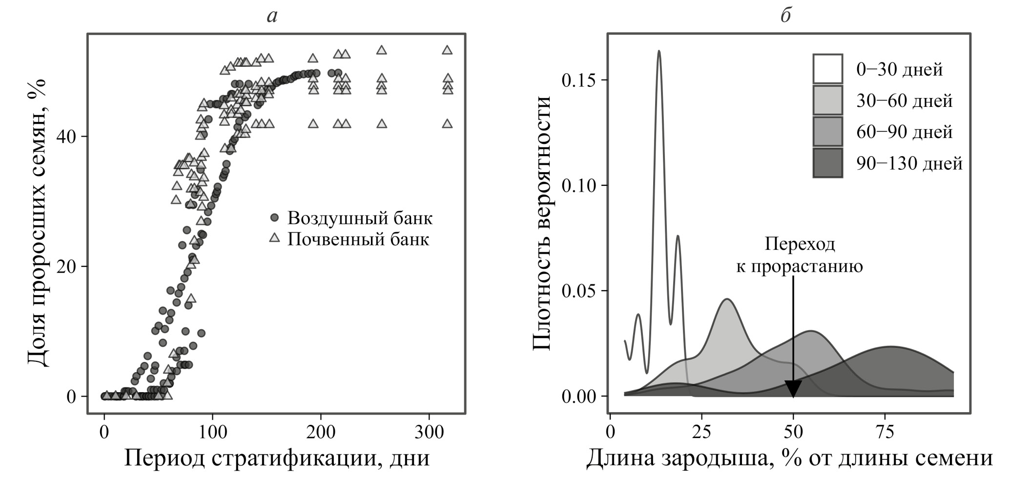 Всхожесть семян и рост зародыша в ходе стратификации. Результаты лабораторных наблюдений показали, что динамика прорастания семян почвенного и воздушного банков в условиях холодовой стратификации имела вид логистической кривой (рис. 6а). Первые прорастающие семена отмечали не ранее 60–70 дней от начала стратификации. В последующие 60 дней наблюдали экспоненциальное увеличение количества проросших семян. На 180 день стратификации общая всхожесть семян достигла 50% и далее не изменялась.