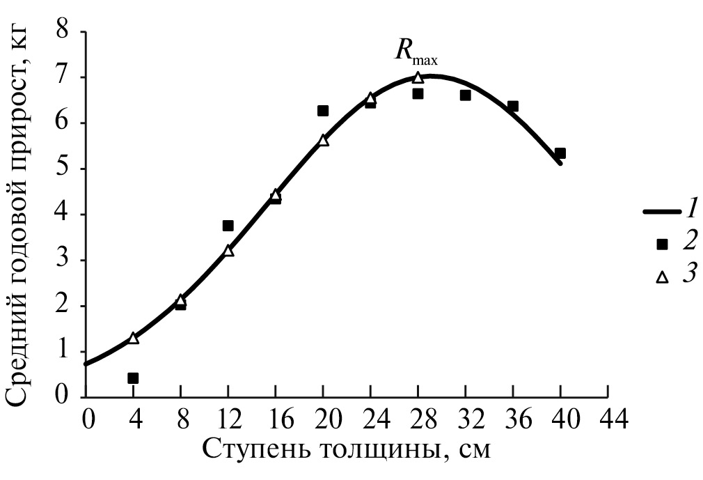 где R̂uᵢ – оценка среднего годового прироста дерева ui-той ступени толщины в данных условиях; R̂max – оценка максимального среднего годового прироста дерева в данных условиях.
