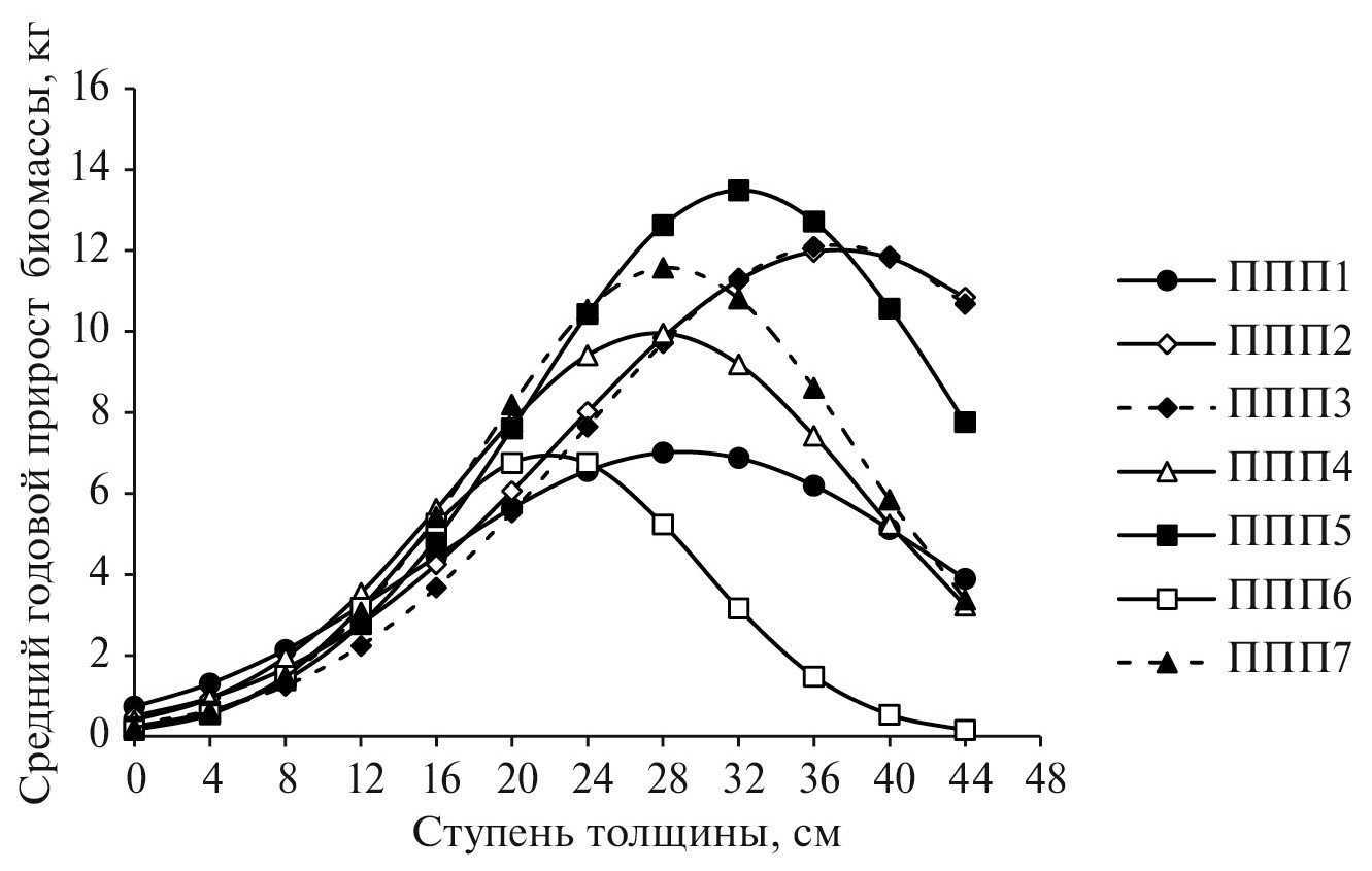 Полученные таким образом оценки среднего годового прироста среднего дерева для каждой категории ступени толщины, в свою очередь, можно рассматривать как характеристики гипотетического среднего дерева на некоторой стадии его развития. В рамках такой модели последовательность значений среднего годового прироста, поставленных в соответствие ступеням толщины, можно рассматривать как реализацию процесса изменения данной характеристики гипотетического среднего дерева.