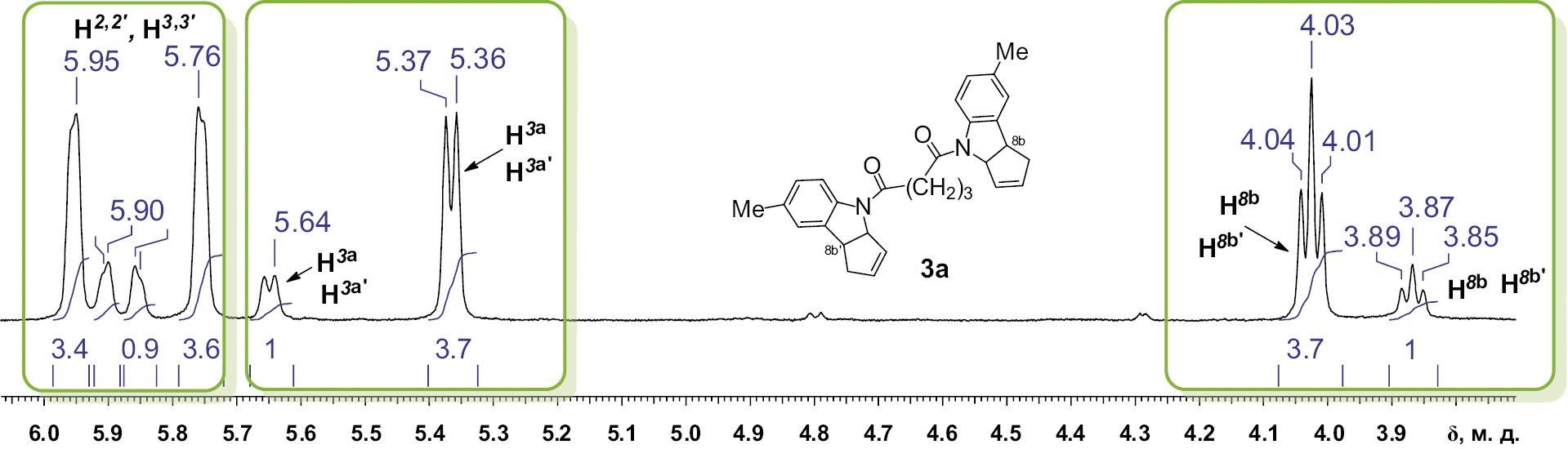 В данном исследовании нами показано, что аналогичная тенденция к удвоению сигналов некоторых протонов в спектре ЯМР 1H соединений, в которых имеется остов N-ацил-7-метил-1,3а,4,8b-тетрагидроциклопента[b]индола, сохраняется и при удлинении алифатической цепи фрагмента алканкарбоновой кислоты, находящегося у атома азота. У полученных нами гетероциклов 3a, б при углеродных атомах С5 и С5′ заместителей нет и в их спектрах ЯМР 1Н, снятых в CDCl3, появляются удвоенные сигналы, среди которых наиболее отчетливо различаются пики протонов Н8b,8b′, Н3a,3a′, Н2,2′ и Н3,3′ тетрагидроциклопента[b]индольных фрагментов. Причем соотношение интенсивности этих удвоенных сигналов индолинового остова соединений 3a, б в дейтерохлороформе примерно такое же (рис. 1), что и в случае ранее полученного и обсужденного выше N-ацетильного аналога [37] (схема 2). В спектре ЯМР 13С удвоение сигналов также есть, разница в химических сдвигах Δδ углеродных атомов минорного и преобладающего ротамеров различаются от 0.15 до 3.0 м. д. Две карбамидных углеродных атома N–C=O, на которых ротамерия вроде бы должна была больше всего подействовать, тем не менее их химические сдвиги отличаются незначительно (Δδ = 0.15 м. д.).