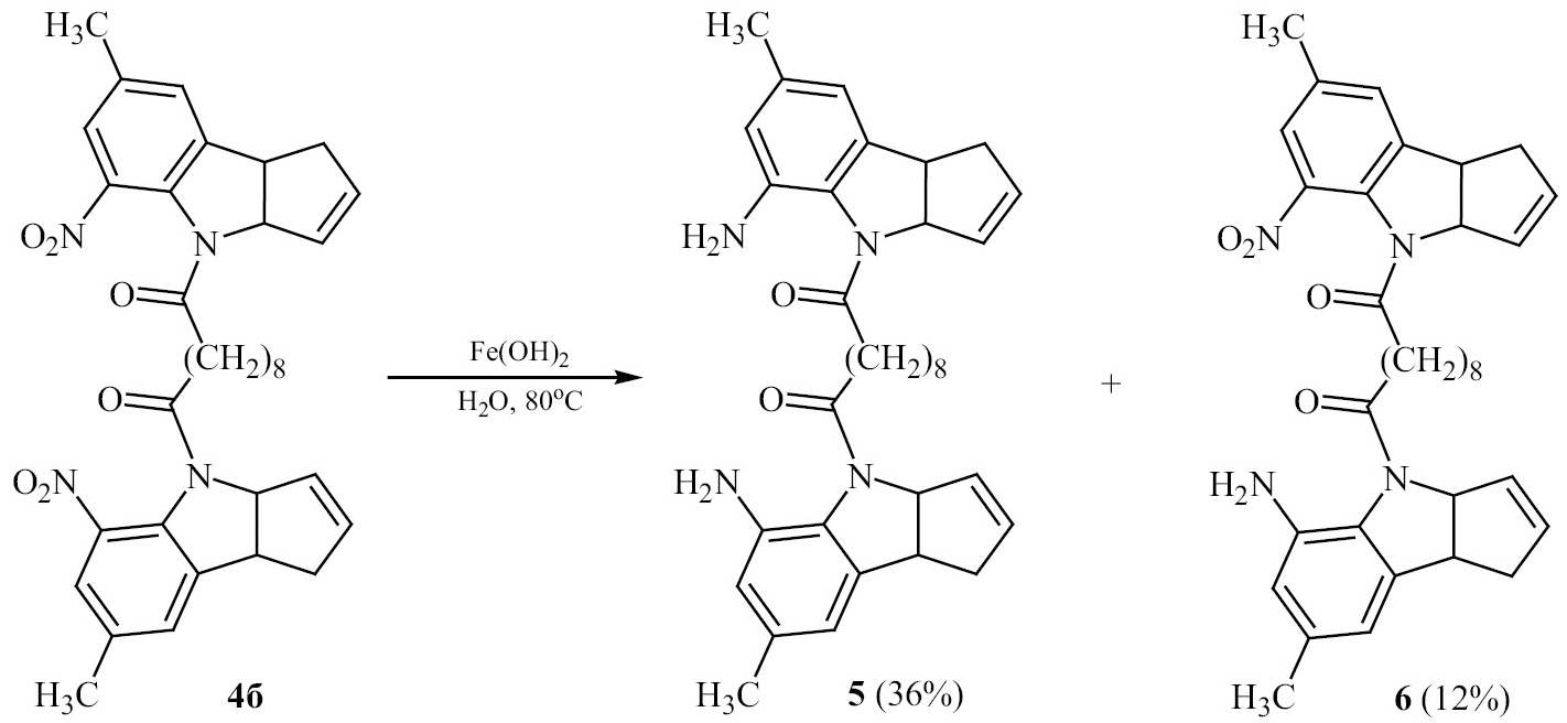 4,4′-(1,10-Диоксодекан-1,10-диил)бис(7-метил-1,3a,4,8b-тетрагидроциклопента[b]индол-5-амин) (5). Суспензию 0.6 г (1.0 ммоль) динитропроизводного 4б в 6 мл разбавленного аммиака (H2O–NH3, 20:1) смешивали с суспензией Fe(OH)2, приготовленной из 7.8 г (27 ммоль) FeSO4·7H2O и 3.6 мл конц. аммиака в 27 мл воды. Смесь доводили до кипения в течение 30 мин при энергичном перемешивании. После охлаждения образовавшийся осадок отфильтровывали и промывали водой и хлороформом. Водную фазу экстрагировали хлороформом, объединенные экстракты сушили Na2SO4. Растворитель упаривали в вакууме, остаток хроматографировали на колонке с силикагелем (элюент – C6H6, затем С6H6−EtOAc, 5:1). В первых фракциях получили 0.066 г (11%) непрореагировавшего исходного соединения 4б. Дальнейшим элюированием выделяли продукт неполного восстановления 6 (0.07 г, 12%). В следующих фракциях получали диамин 5 (0.19 г, 36%), белые кристаллы, т. пл. 249–251°С (бензол). Спектр ЯМР 1Н (CDCl3), δ, м. д.: 1.32–1.80 м (12Н, СH2), 2.23 с (6Н, СН3), 2.53–2.66 м (6Н, СH2, H1А, H1А′), 2.83–2.89 м (2H, H1B,1B′), 3.96 т (2Н, H8b,8b′, J 7.5 Гц), 4.68 уш. с (4H, 2NH2), 5.33 д (2Н, H3a,3a′, J 7.3 Гц), 5.71–5.74 м, 5.87–5.90 м (4Н, H2,2′, H3,3′), 6.39 с (2Н, H8,8′), 6.42 с (2Н, H6,6′). Спектр ЯМР 13C (CDCl3), δС, м. д.: 21.74 (2CH3), 25.32, 28.75, 28.86 (C3′′,8′′, C4′′,7′′, C5′′,6′′), 36.36 (C2′′,9′′), 39.45 (C1, C1′), 49.51 (C8b, C8b′), 69.97 (C3a, C3a′), 120.45, 124.17, 131.47, 133.19 (C2,2′, C3,3′, C6,6′, C8,8′), 131.14, 131.63, 137.66, 146.87 (C4a,4a′, C5,5′, C7,7′, C8b,8b′), 168.77 (2NC=O). Масс-спектр, m/z: 538.3 [M]+ (вычислено для С34H42N4O2: 538.3). Найдено, %: С 75.69; H 7.79; N 10.33. С34H42N4O2. Вычислено, %: С 75.80; H 7.86; N 10.40.