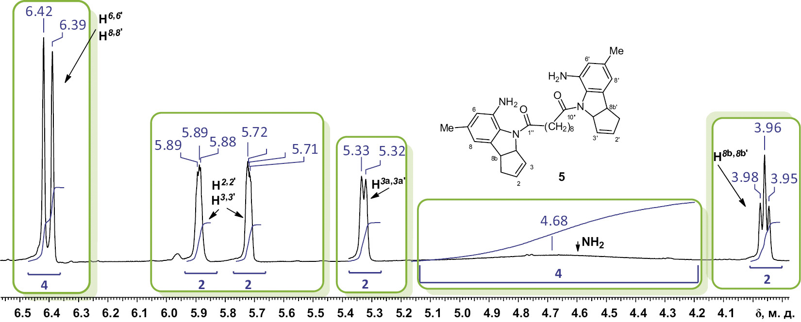 Восстановлением соединения 4б свежеприготовленным Fe(OH)2 получено 5,5′-диаминопроизводное 5 (схема 4). Спектральные характеристики полученного соединения, относящиеся к циклопента[b]индольным фрагментам этой молекулы (рис. 3), практически совпадают с сигналами ранее описанного N-ацетильного гомолога [39].