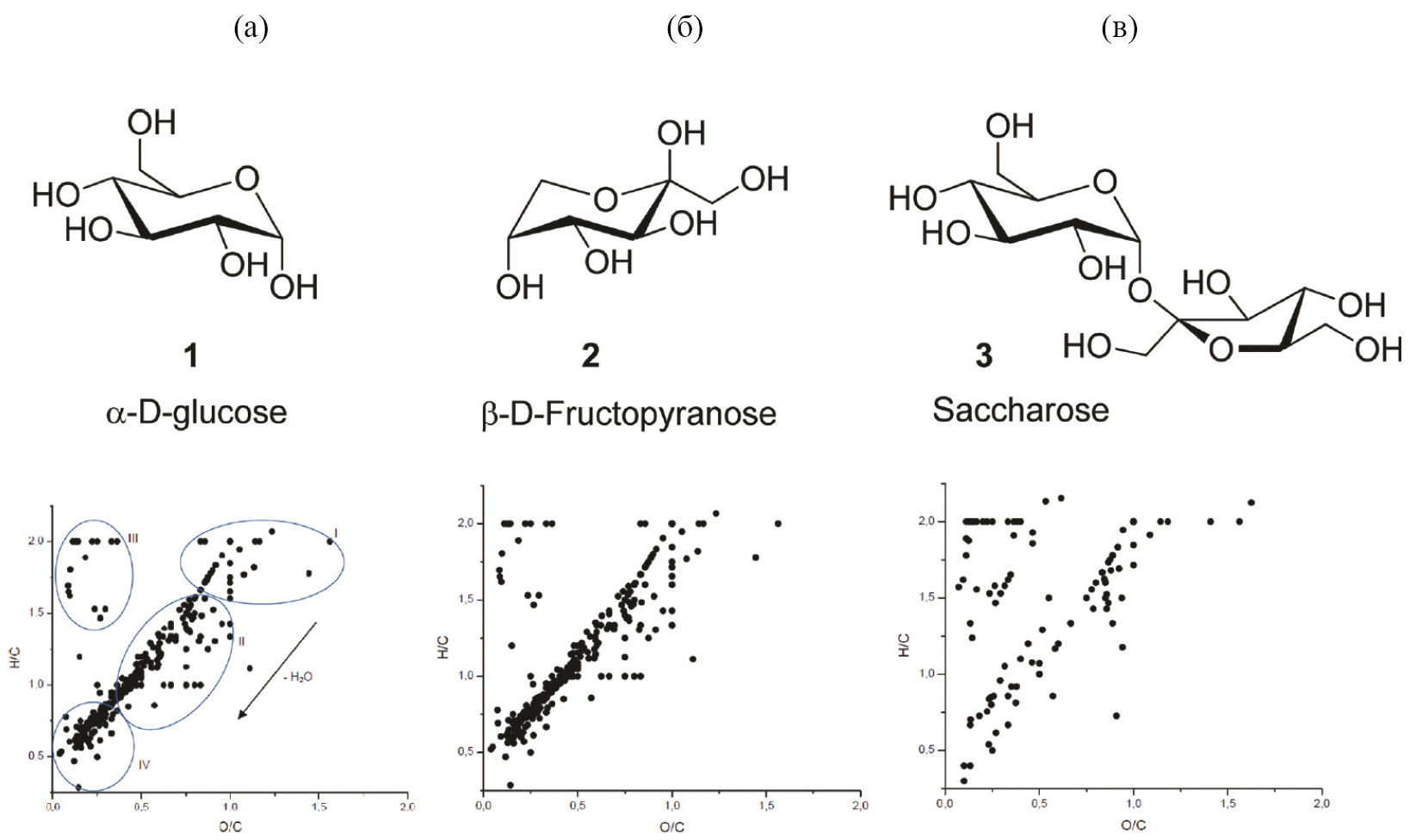 Рис. 1. Двумерные диаграммы ван Кревелена (зависимость мольного отношения H/C от мольного отношения O/C) для (a) 284 сигналов продуктов пиролиза глюкозы, (б) 113 сигналов продукта пиролиза фруктозы и (в) 158 сигналов продуктов пиролиза сахарозы. Воспроизведено из [23]