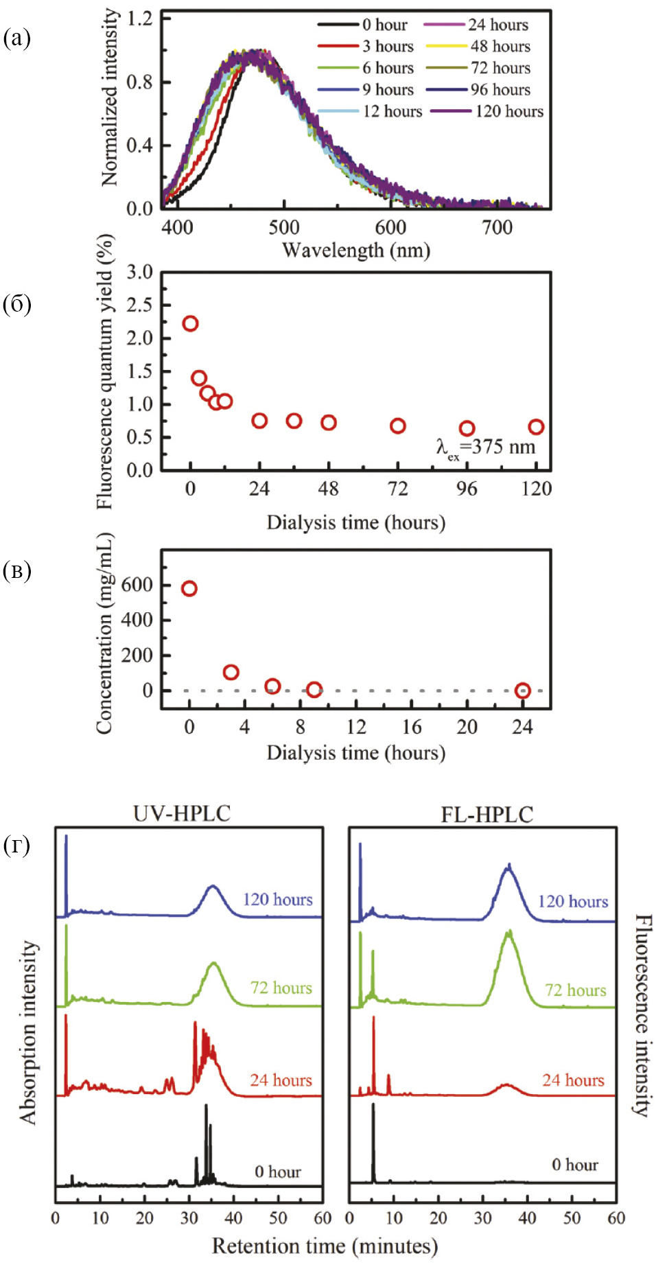 Рис. 2. Спектры испускания (a), квантовый выход флуоресценции (б) и концентрация (в) продукта микроволновой обработки лимонной кислоты в зависимости от продолжительности диализа, а также хроматограммы соответствующих продуктов (г), зарегистрированные по ультрафиолетовому поглощению (UV-HPLC) и флуоресценции (FL-HPLC). Воспроизведено из [42]