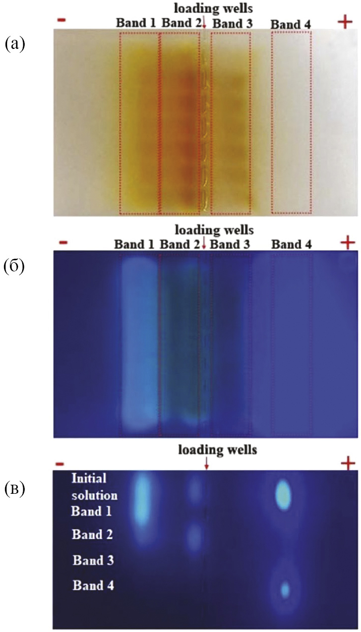 Рис. 3. Электрофоретическое разделение продукта гидротермальной обработки смеси лимонной кислоты с этилендиамином, визуализация в естественном свете (а) и при освещении ультрафиолетовой лампой (б, в): хроматограммы исходной смеси с обозначенными полосами, содержащими различные продукты (а, б) и исходной смеси и выделенных фракций (в). Воспроизведено из [47]