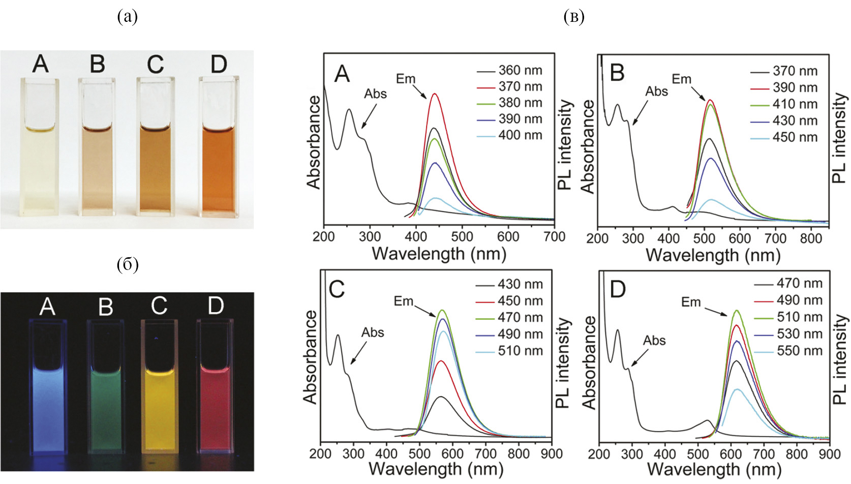 Рис. 5. Фотографии образцов A–D (УКТ на основе лимонной кислоты и фенилендиамина) в естественном (а) и УФ (б) освещении, спектры поглощения (Abs) и испускания (Em) при различных значениях λex (нм) соответствующих образцов (в). Воспроизведено из [64]