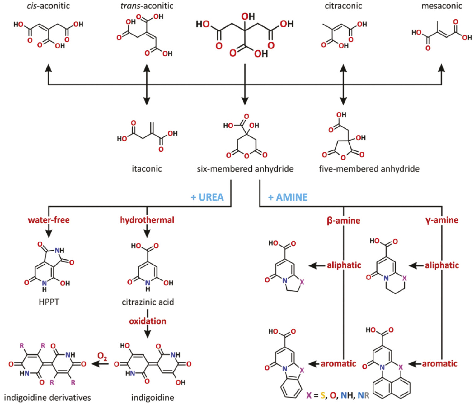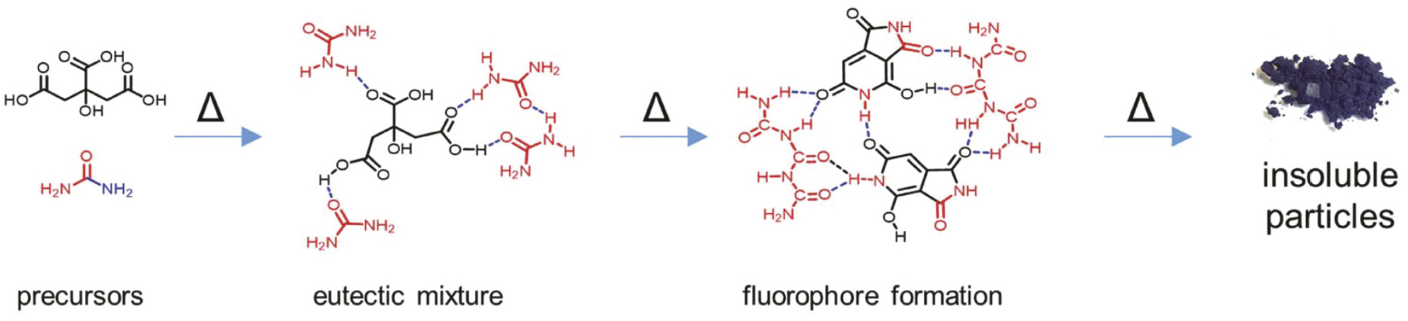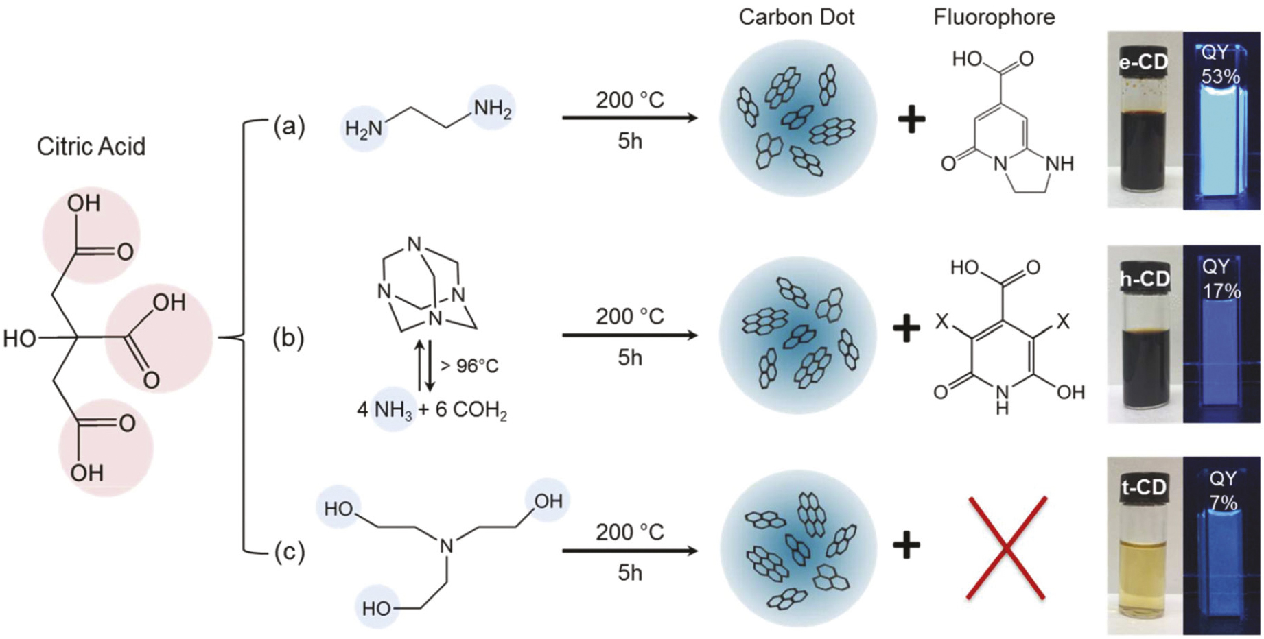 К настоящему времени этот механизм наиболее детально изучен для производных лимонной кислоты и различных прекурсоров ряда аминов. Например, в работе [65] путем гидротермальной обработки смесей лимонной кислоты с тремя различными аминами (этилендиамин, гексаметилентетрамин и триэтаноламин) были получены три вида УКТ (рис. 6). Анализ состава и строения УКТ показал, что в случае первичного амина (этилендиамин) и третичного амина, при нагревании разлагающегося с образованием аммиака (гексаметилентетрамин), полученные продукты характеризовались высоким квантовым выходом флуоресценции, а их оптические свойства были обусловлены присутствием производных цитразиновой кислоты (молекулярного флуорофора класса пиридинов). В то же время образование этого флуорофора в случае триэтаноламина невозможно, и полученные УКТ показали более низкий квантовый выход.