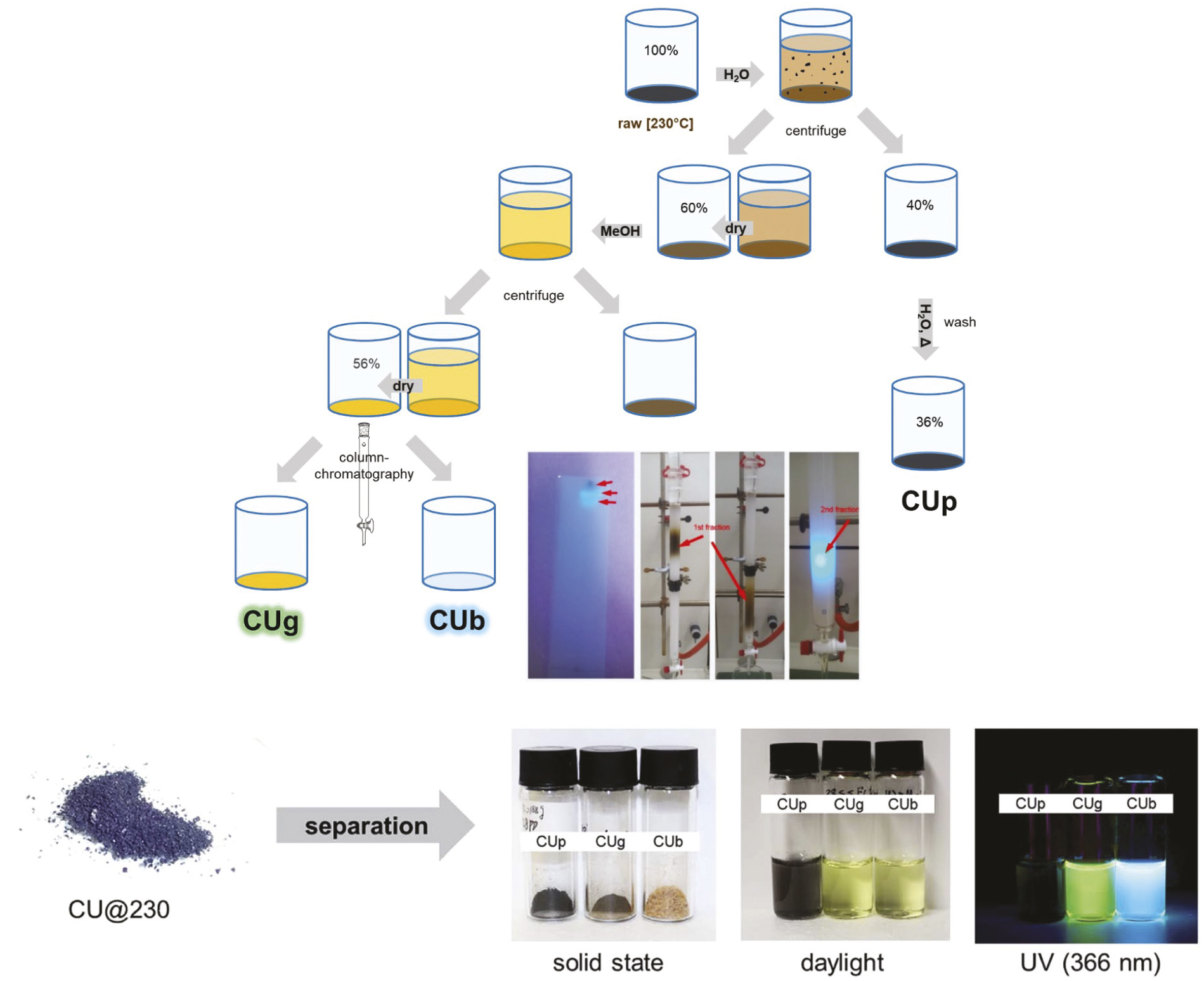 Как было указано в предыдущем разделе, механизм образования УТ включает сложный набор последовательных и параллельных реакций, поэтому структура получаемых продуктов не может быть предсказана только исходя из представлений классической органической химии. Еще более важным (с практической точки зрения) следствием сложности протекающих физико-химических процессов является неоднородность продукта. В результате гидротермальной обработки углеводов может образовываться широкий спектр продуктов, включая низкомолекулярные соединения, углеродные точки и наночастицы, а также более крупные углеродные микросферы [12, 39–41]. В связи с этим, выделение и очистка УТ являются, наряду с непосредственно синтезом, наиболее важными этапами их получения, хотя лишь в части опубликованных работ соответствующие процедуры ясно документированы. Даже при наличии исчерпывающей информации отсутствие общепринятых стандартных протоколов очистки затрудняет сравнение данных из разных источников. Так, в работе [42] отмечается, что на нынешнем этапе развития исследований в области УТ использование неочищенных или недостаточно очищенных продуктов для интерпретации механизмов их образования и генерации флуоресценции приводит к искажению данных, при этом возникает больше новых вопросов, чем получается ответов.