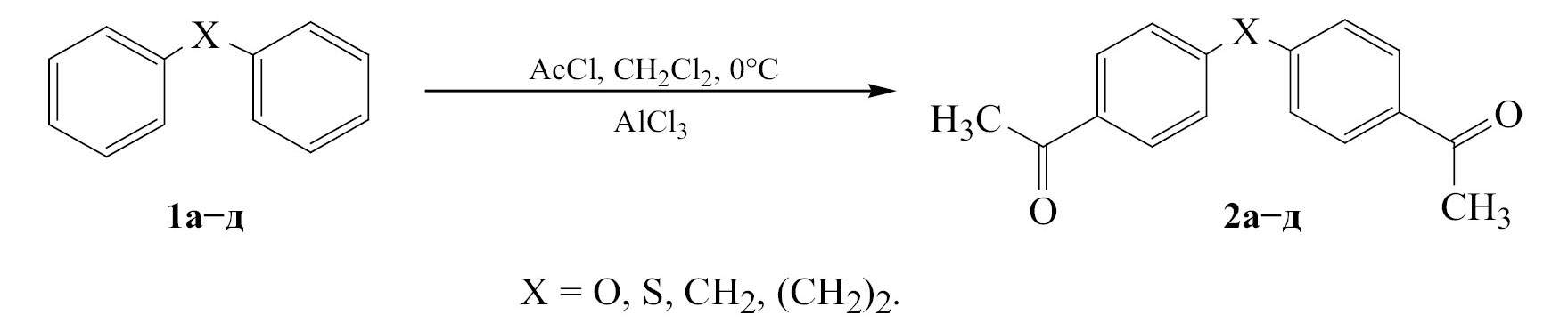 Синтез прекурсоров (жирноароматических дикетонов 2а–д) был осуществлен нами ранее ацетилированием ароматических углеводородов: дифенилоксида 1а [11–13, 15, 16], дифенилметана(этана) 1б, в [17], бифенила 1г [18] и дифенилсульфида 1д [19] по реакции Фриделя–Крафтса [20] (схема 2, табл. 1).