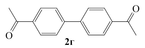 Бис(4-ацетилбифенил) (2г). Выход 46.46 г (97.5%), белый порошок т. пл. 193–194°С (толуол). ИК спектр, ν, см–1: 1677 (С=О), 1603, 1554, 1419, 1395, 1357, 1310, 1262, 1185, 1120, 1083, 1004, 960, 898, 830, 817, 767, 728. Спектр ЯМР 1Н (CDCl3), δ, м. д. (J, Гц): 2.67 c (6Н, Me), 8.08 д (4Н, Нo-Ar, J 2.5), 7.74 д (4Н, Нм-Ar, J 2.5). Спектральные данные хорошо согласуются с ранее приведенными данными [41].