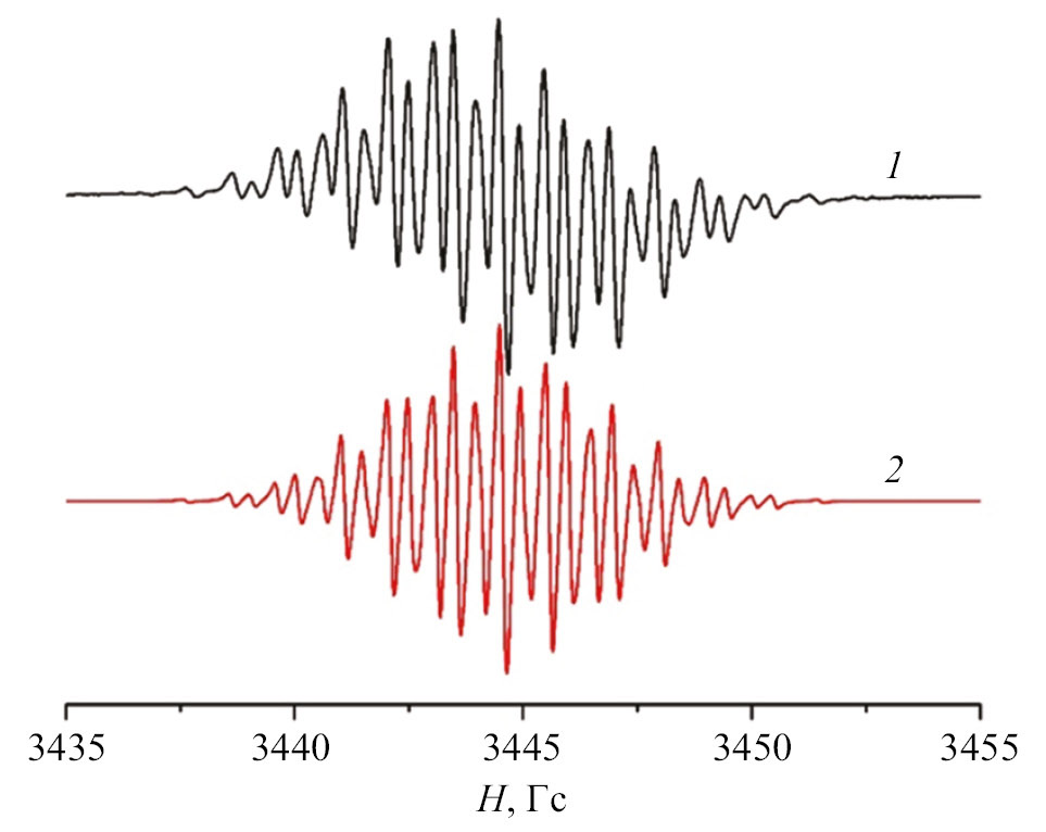 Рис. 6. Экспериментальный (1) и расчетный (2) спектры ЭПР радикала 4 (CF3COOH, толуол, g = 2.002, aN = 7.59 Гс, aH = 4.64 Гс, aH = 3.79 Гс, a2H = 3.54 Гс, aH = 1.52 Гс).