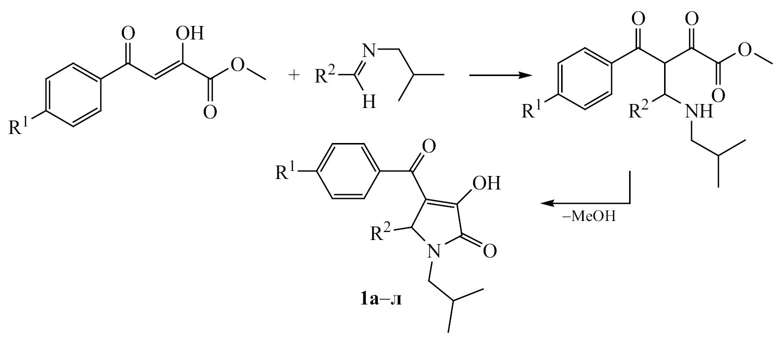 Соединения 1а–л в реакции с хлоридом железа(III) дают характерное вишневое окрашивание, что наряду с данными спектров подтверждает их существование преимущественно в енольной форме. На основании литературных данных [1] можно предположить, что реакция протекает с образованием промежуточного основания Шиффа, по двойной связи которого присоединяется исходный эфир с последующей циклизацией промежуточного эфира 4-арил-3-ароил-4-изобутиламино-2-оксобутановой кислоты в соответствующие 3-гидрокси-3-пирролин-2-оны 1а–л (схема 2).