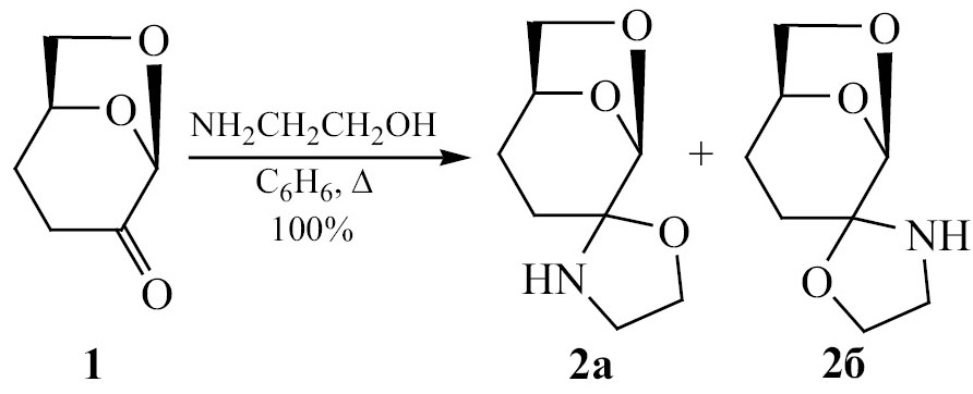 Нам удалось осуществить простой способ получения 2-замещенного оксазолидина 2a, б кипячением в бензоле цирена 1 с этаноламином с количественным выходом (схема 1). Полученные оксазолидины 2a, б представляют собой смесь диастереомеров в соотношении 1:1. К сожалению, попытки получения оксазолидина из левоглюкозенона 4 в этих условиях приводили к смеси трудно идентифицируемых соединений.