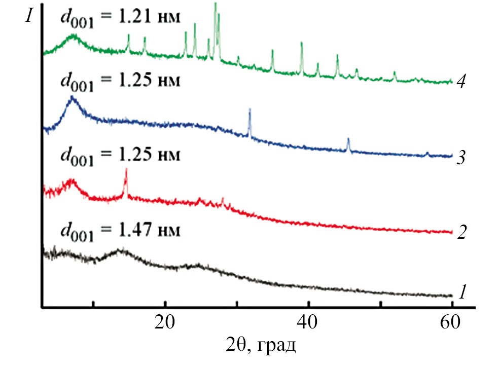 Разрушение хлорсилильного производного сульфенилхлорида ацетилацетоната алюминия приводит к промежуточному нерастворимому продукту, где повышается значение межплоскостного расстояния. Дальнейшее извлечение приводит к получению растворимого продукта (рис. 4), в котором также увеличивается значение межплоскостного расстояния. В случае более значительного разрушения для толуольного продукта разброс значений d001 оказывается больше, и происходит большее расширение цепи.