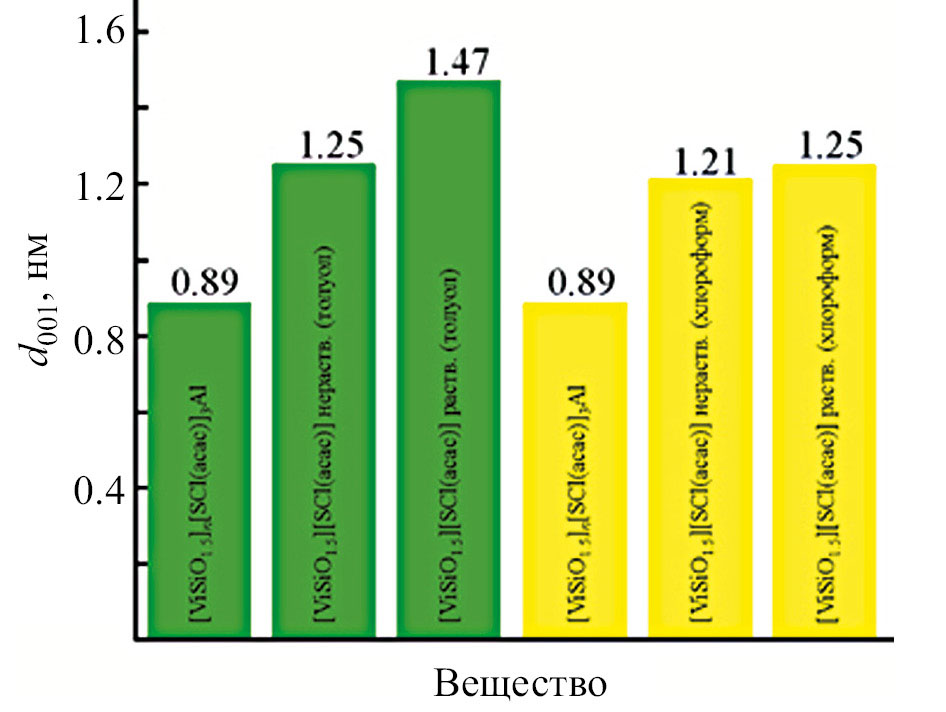 Рис. 4. Изменение межплоскостного расстояния продуктов при извлечении в толуоле и хлороформе (данные для [VinSiO₁.₅]n[SCl(acac)]₃Al взяты из работы [9]).