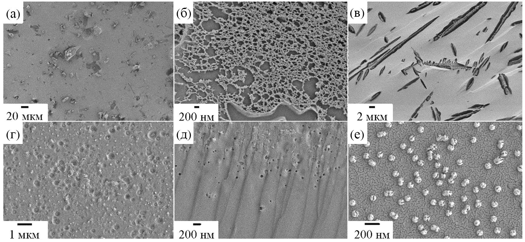 Рис. 7. Увеличенные изображения СЭМ растворимого продукта, выделенного после извлечения кислотой в растворе хлороформа в виде твердого порошка (а–в) и тонкой пленки на предметном стекле (г–е).