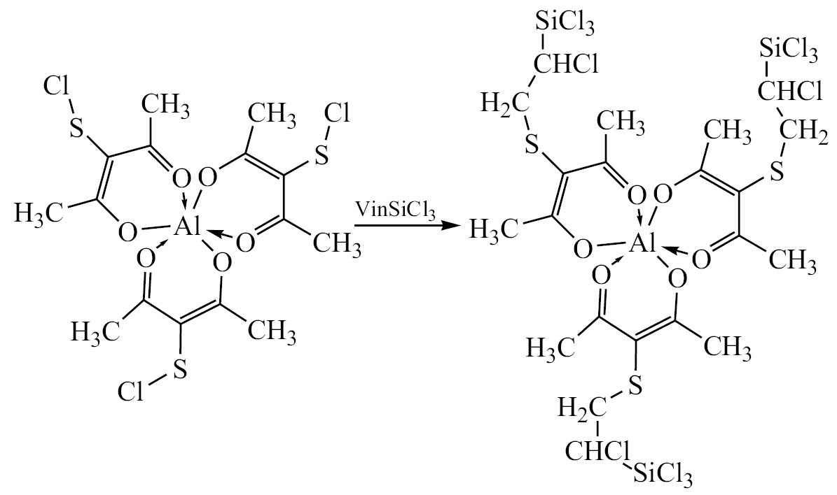 В качестве модельной реакции взят процесс, описанный в работе [8]. Взаимодействие сульфенилхлорида ацетилацетоната алюминия с винилтрихлорсиланом протекает как присоединение по двойной связи (схема 1).