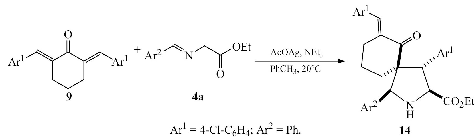 Описано довольно много примеров каталитического 1,3-диполярного присоединения иминов эфиров аминокислот по одной двойной связи диарилиденкетонов [16–19]. В то же время, примеры реакции, где был использован избыток имина, и присоединение диполярофила протекало по обеим двойным связям, встречаются редко. Это может быть обусловлено стерическими препятствиями, которые возникают при использовании диполя и диполярофила с арильными заместителями в комбинации с объемными хиральными катализаторами [18, 19]. Однако в случае использования гидроксида натрия с тетрабутиламмоний бромидом [6] и при использовании комплекса ацетата серебра с трифенилфосфином [5] наблюдалось образование соответствующих диаддуктов.