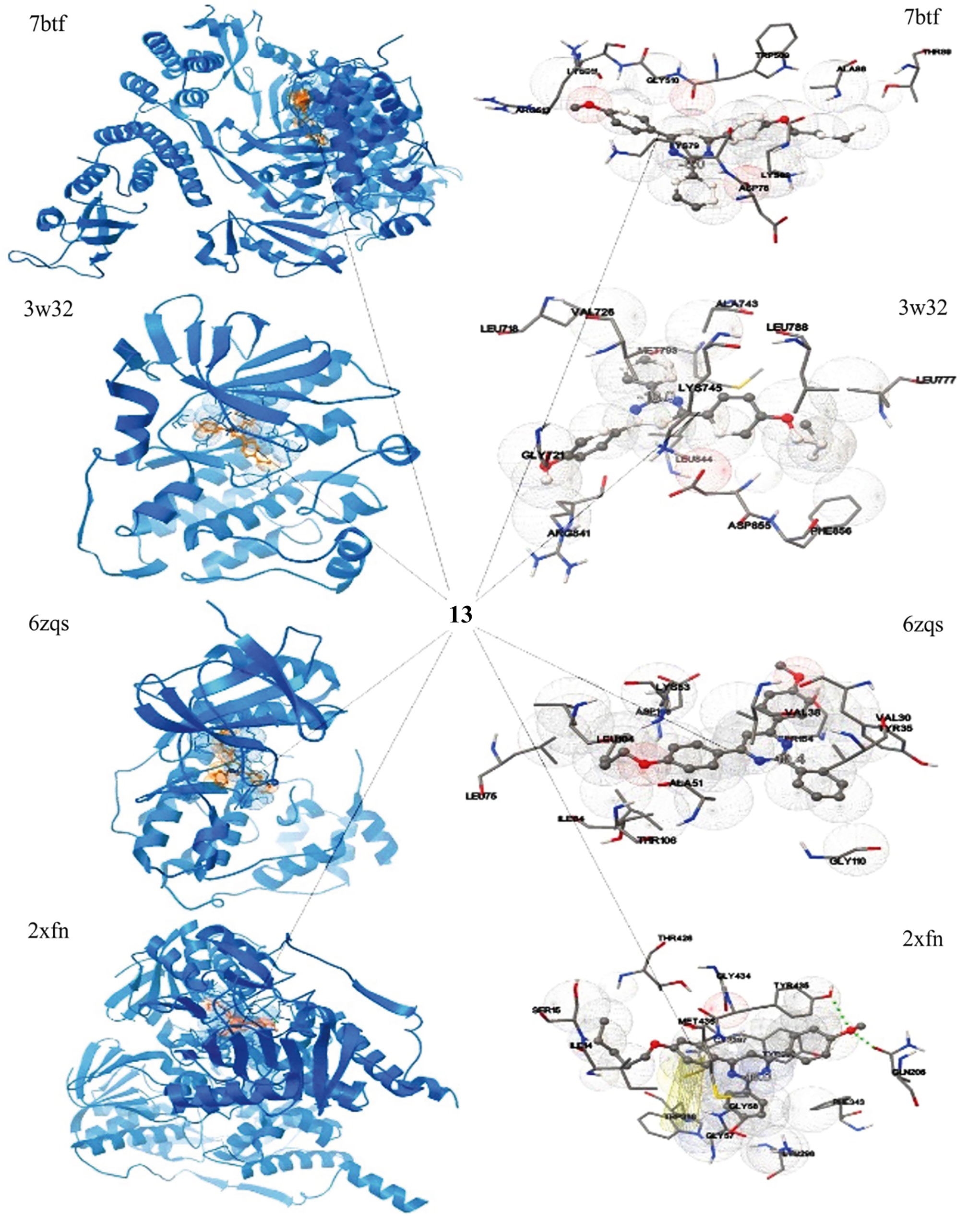 Результаты докинга показывают, что в случае с 2xfn соединение 13 образует две водородные связи: со свободной карбоксильной группой Gln206 (длина связи 2.739 Å) и с гидроксильной группой Tyr435 (длина связи 3.084 Å), а также 2 π–π связи с Trp388 (длина связей 8.588 и 9.248 Å). При докинге с рецептором MAPK14 соединение 13 образует исключительно электростатические и другие слабые связи, однако этого оказалось достаточно для образования довольно хорошего взаимодействия. Та же ситуация повторилась и в случае с EGFR и 7btf. Из общих пространственных моделей взаимодействий следует также, что в случае рецепторов EGFR и MAPK14 соединение 13 взаимодействует по соседству с β-щитами, что соответствует активным центрам белков, и, следовательно, может быть причиной сильного конкурентного ингибирования изучаемых рецепторов.