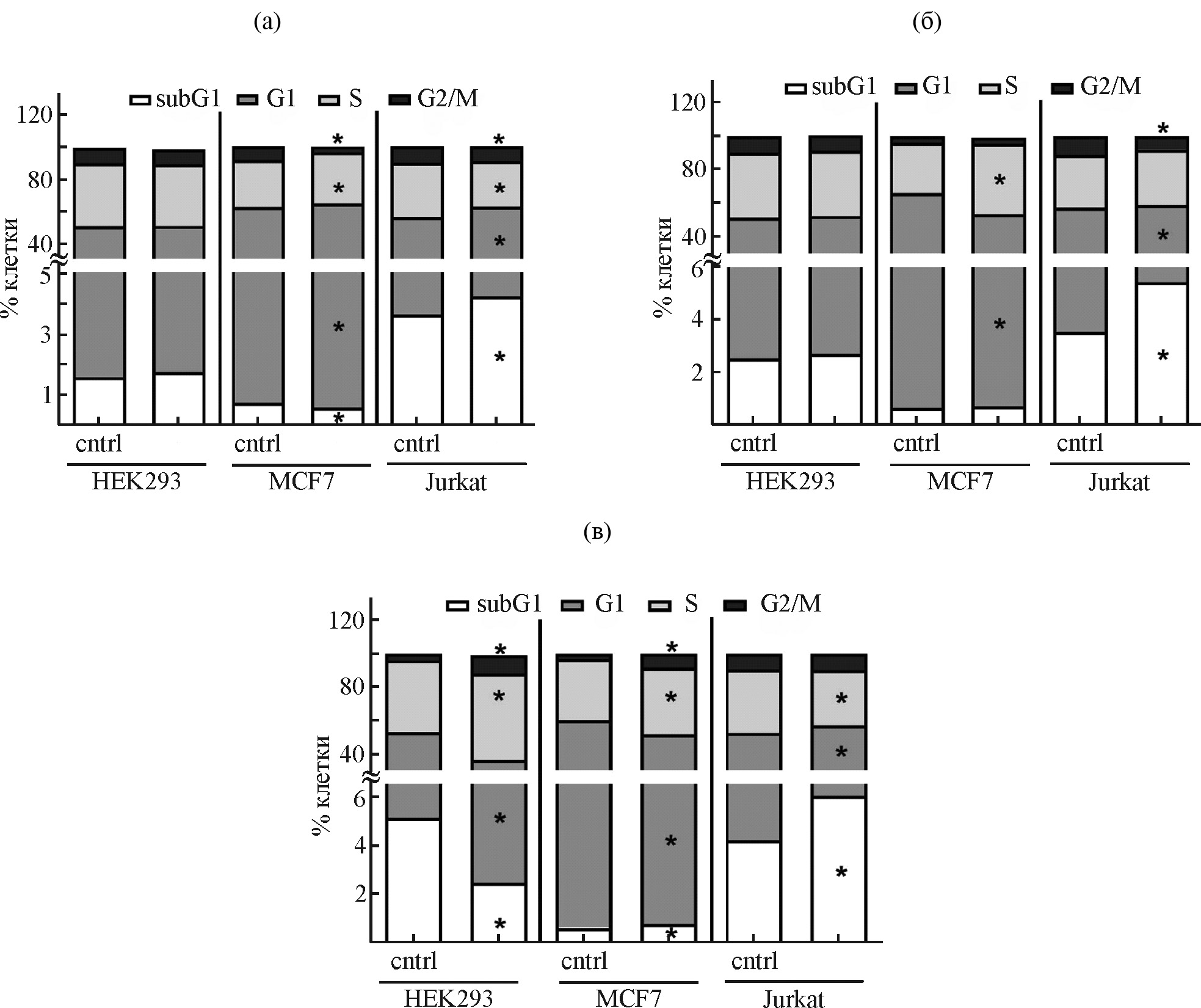 Анализ клеточного цикла. Клетки рассаживали в 6-луночные планшеты в питательной среде DMEM или RPMI, содержащей 10%-ную эмбриональную бычью сыворотку, 2 мМ. L-глутамин. Через 24 ч клетки промывали PBS (2 раза) и меняли среду на DМЕМ/RPMI, содержащую 2 мМ. L- глутамин и инкубировали в течение 24, 48, 72 ч. По истечении времени инкубации клетки трипсинизировали, отмывали PBS и фиксировали 70%-ным этанолом в течение >24 ч при –20°С. Анализ клеточного цикла осуществляли методом проточной цитофлуориметрии после окрашивания клеток пропидийиодидом (PI). Для этого зафиксированные клетки отмывали от этанола 2 раза PBS (3 мин, при 1000g), инкубировали с РНКазой А (100 мкг/мл) 5 мин при комнатной температуре и затем с PI (25 мкг/мл) дополнительные 15 мин (при комнатной температуре, в темноте). Анализ распределения клеток по фазам клеточного цикла проводили на проточном цитофлуориметре Novocyte® 2060 (ACEA Bioscience Inc., США). Численную обработку гистограмм флуоресценции и определение процента клеток, соответствующих по количеству ДНК фазам клеточного цикла, проводили с помощью модуля для оценки клеточного цикла программы NovoExpress 1.2.5 (ACEA Bioscience Inc., США). Эксперименты проводили в 2 биологических повторностях. Статистическую обработку полученных результатов осуществляли в рамках стандартного пакета методов статистического анализа Statistiсa 6.0 для Windows (StatSoft, США), GraphPad Prism 5.0. (GraphPad Software, США).