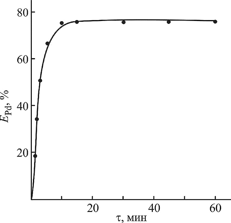 Рис. 1. Зависимость степени извлечения палладия(II) из 1 М. раствора HCl раствором реагента L в хлороформе от времени контакта фаз. сPd = 0.0054 моль/л, сL = 0.0042 моль/л.