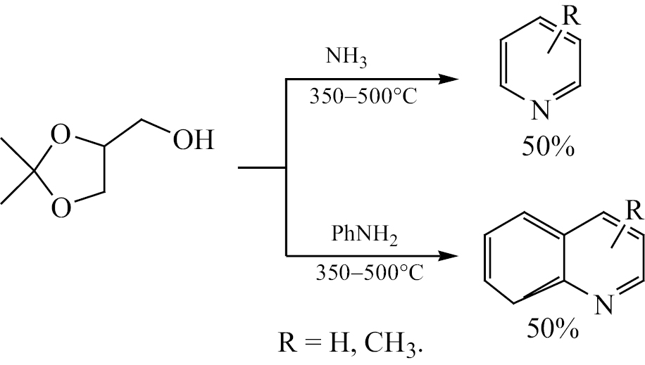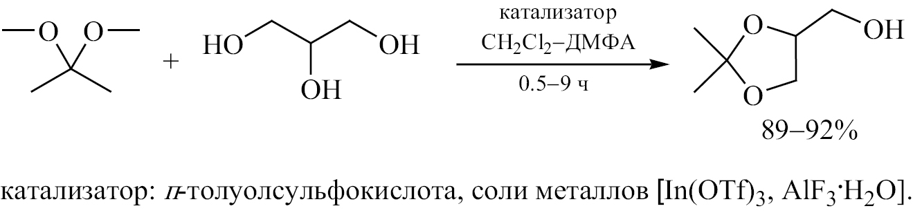 Замена ацетона на 2,2-диметоксипропан [36–40] позволяет провести реакцию более селективно, поскольку кеталь выступает в качестве поглотителя воды (схема 2). В качестве катализаторов используются п-толуолсульфокислота или соли металлов. Выходы 2,2-диметил-4-оксиметил-1,3-диоксолана достигают 89–92%.