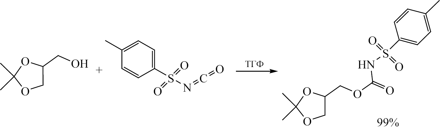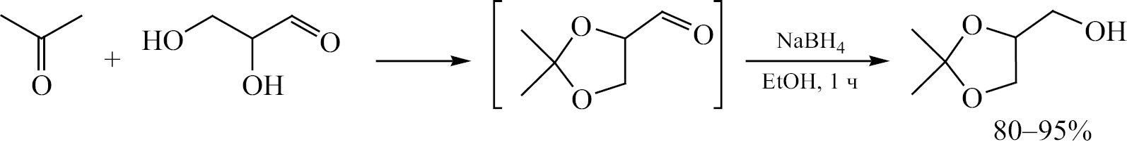 Количественный синтез 2,2-диметил-4-оксиметил-1,3-диоксолана реакцией глицеральдегида с ацетоном [41–47] включает восстановление боргидридом натрия промежуточного гетероциклического альдегида без его выделения (схема 3).