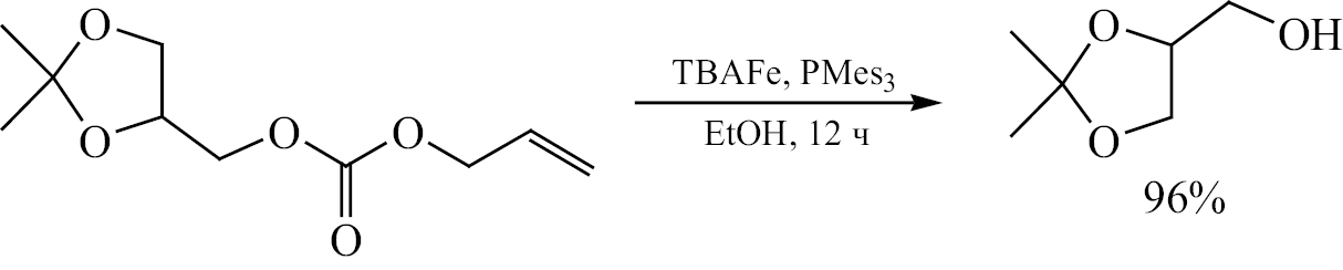 В работе [51] описана регенерация 2,2-диметил-4-оксиметил-1,3-диоксолана из аллилкарбоната, катализируемая комплексом железа (схема 6). Реакция осуществляется в присутствии каталитических количеств комплекса железа Bu4N[Fe(CO)3(NO)] (TBAFe) и тримезитилфосфина в этаноле за 12 ч. Выход 2,2-диметил-4-оксиметил-1,3-диоксолана составляет 96%.