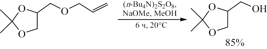 В работе [52] предложен метод окислительной селективной трансформации аллилового эфира в 2,2-диметил-4-оксиметил-1,3-диоксолан в присутствии персульфата тетрабутиламмония (схема 7). Процесс осуществляется в метаноле в присутствии метилата натрия за 6 ч при 20°C и приводит к образованию 2,2-диметил-4-оксиметил-1,3-диоксолана с выходом 85%.