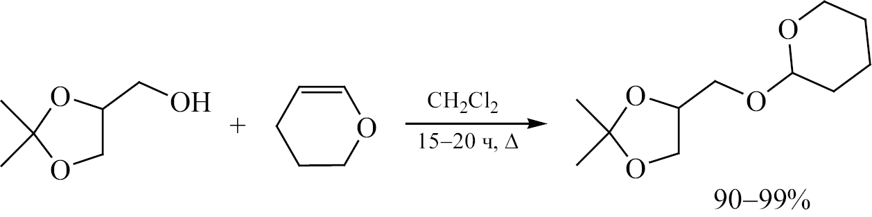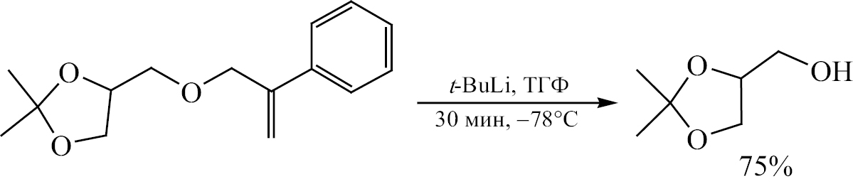 Удаление защитной группы в арилаллиловом эфире (схема 11) осуществляется под действием трет-бутиллития [60]. Реакция проводится в среде тетрагидрофурана в течение 30 мин при –78°C и приводит к образованию 2,2-диметил-4-оксиметил-1,3-диоксолана с выходом 75%.