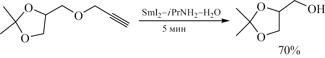 Система SmI2–изопропиламин–вода переводит (схема 12) алкилпропаргиловый эфир 2,2-диметил-4-оксиметил-1,3-диоксолана в спирт [61]. Реакция протекает в течение 5 мин при комнатной температуре. Выход 2,2-диметил-4-оксиметил-1,3-диоксолана составляет 70%.