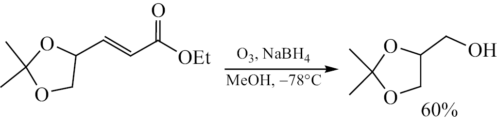 При низкотемпературном озонолизе этил-3-(2,2-диметил-1,3-диоксолан-4-ил)акрилата и восстановлении промежуточно образующихся пероксидов боргидридом натрия наблюдается образование 2,2-диметил-4-оксиметил-1,3-диоксолана (схема 14) [64]. Отмечается полная конверсия исходного субстрата в 2,2-диметил-4-оксиметил-1,3-диоксолан с выходом 60%, побочными продуктами являются линейные кислоты.