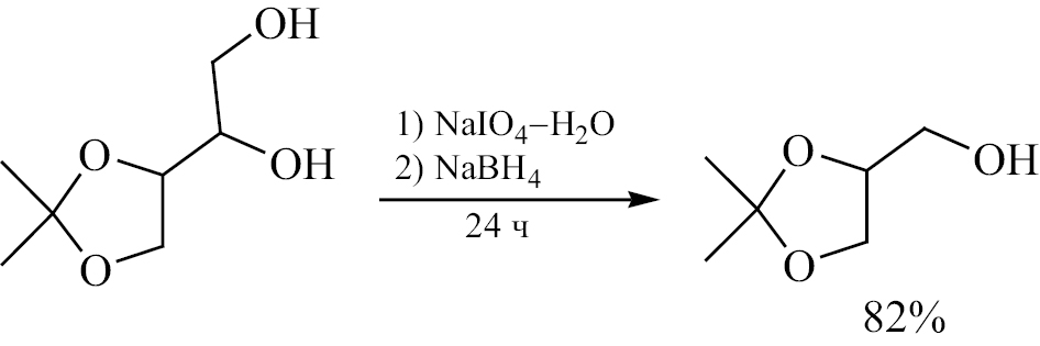 Расщеплением соответствующего замещенного этиленгликоля водным раствором периодата натрия и восстановлением промежуточных продуктов боргидридом натрия получают 2,2-диметил-4-оксиметил-1,3-диоксолан с выходом 82% (схема 15) [65, 66]. Реакцию проводят в течение 24 ч при комнатной температуре.