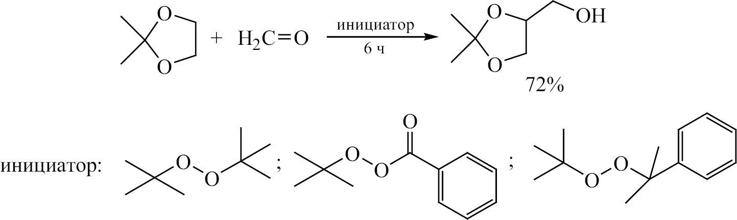 2,2-диметил-1,3-диоксолан взаимодействует с формальдегидом в присутствии свободнорадикальных инициаторов (схема 16) с образованием 2,2-диметил-4-оксиметил-1,3-диоксолана c выходом 72% [67]. Промежуточные циклические алкоксильные радикалы быстро присоединяются по кратной углерод-кислородной связи альдегида и рост цепи продолжают кислород-центрированные радикалы.