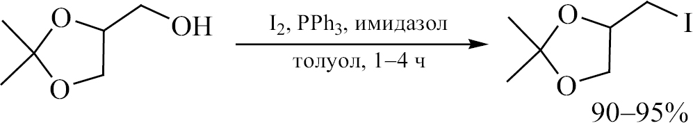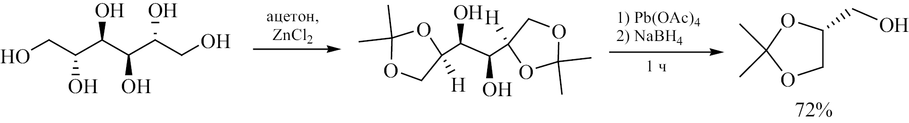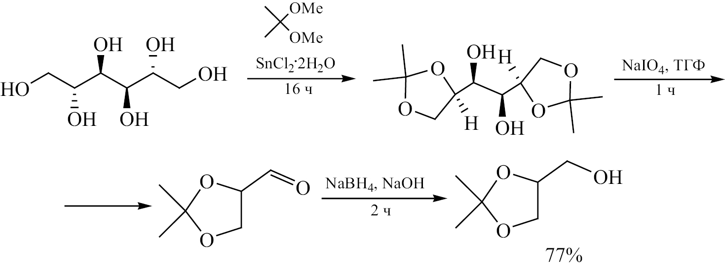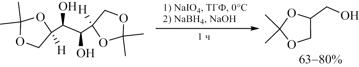 Окислительное расщепление 1,2:5,6-бис-О-(1-метилэтилиден)-D-маннитола периодатом натрия и последующее восстановление промежуточного альдегида боргидридом натрия приводят к образованию 2,2-диметил-4-оксиметил-1,3-диоксолана с выходом 63–80% (схема 17) [68, 69].