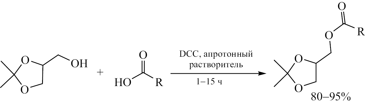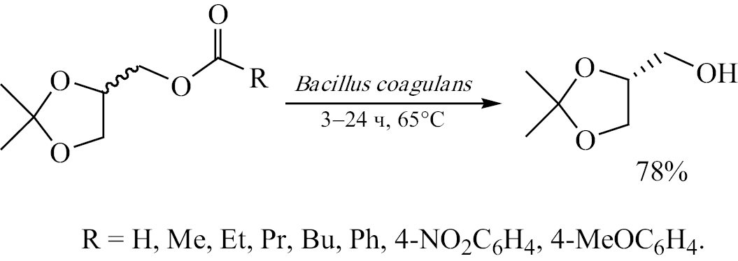 В работе [85] энантиоселективный гидролиз различных эфиров (RS)-изопропилиденглицерина проводится с использованием карбоксилэстеразы, связанной с клеточной стенкой бактерии Bacillus coagulans NCIMB 9365, дающих (S)-2,2-диметил-4-оксиметил-1,3-диоксолан как главный энантиомер (схема 22). Наибольшая селективность (ее = 80–100%) наблюдается в случае бензоата.