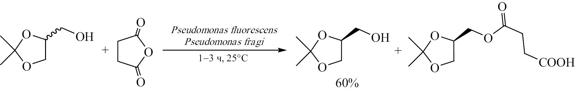 Описано использование грамотрицательных бактерий Comamonas testosteroni для получения (S)-энантиомера 2,2-диметил-4-оксиметил-1,3-диоксолана c выходом 60–65% (схема 25) [88]. Энантиомерная чистота S-2,2-диметил-4-оксиметил-1,3-диоксолана зависимости от используемого спирта и времени выдерживания реакции составляет от 72 до 94%.