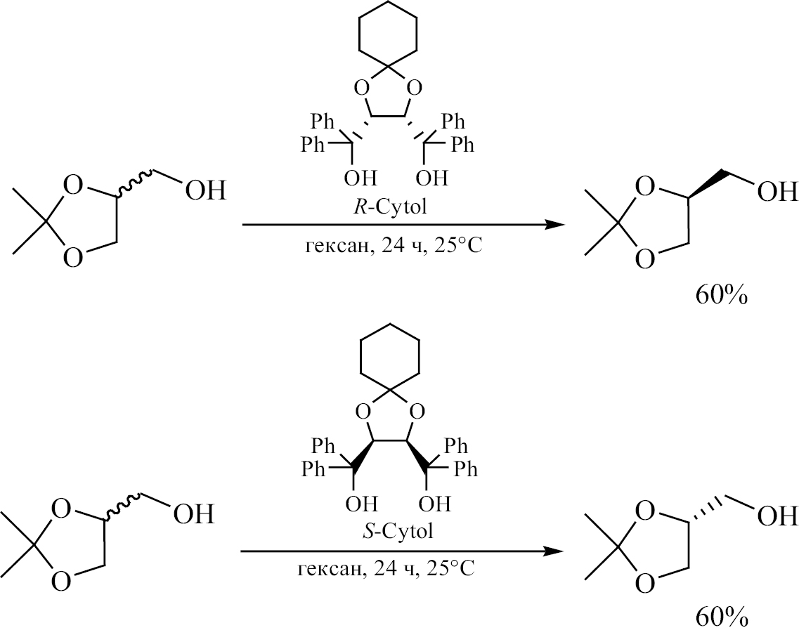 Индивидуальные R- и S-стереоизомеры 2,2-диметил-4-оксиметил-1,3-диоксолана получают с выходом 60% и энантиомерной чистотой 97% энантиоселективной двухстадийной кристаллизацией с хиральным диолом 2,3-О-циклогексилиден-1,1,4,4-тетрафенилтреитол.