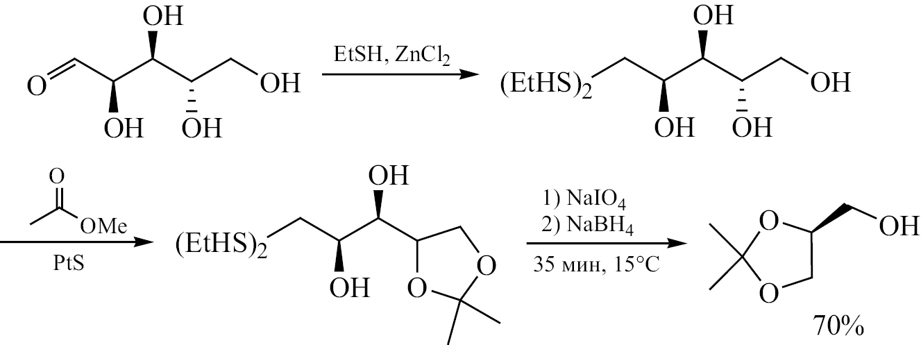 R-Энантиомер 2,2-диметил-4-оксиметил-1,3-диоксолана получен из L-арабинозы (схема 32) с высокой энантиоселективной чистотой (80%) и выходом 44%.